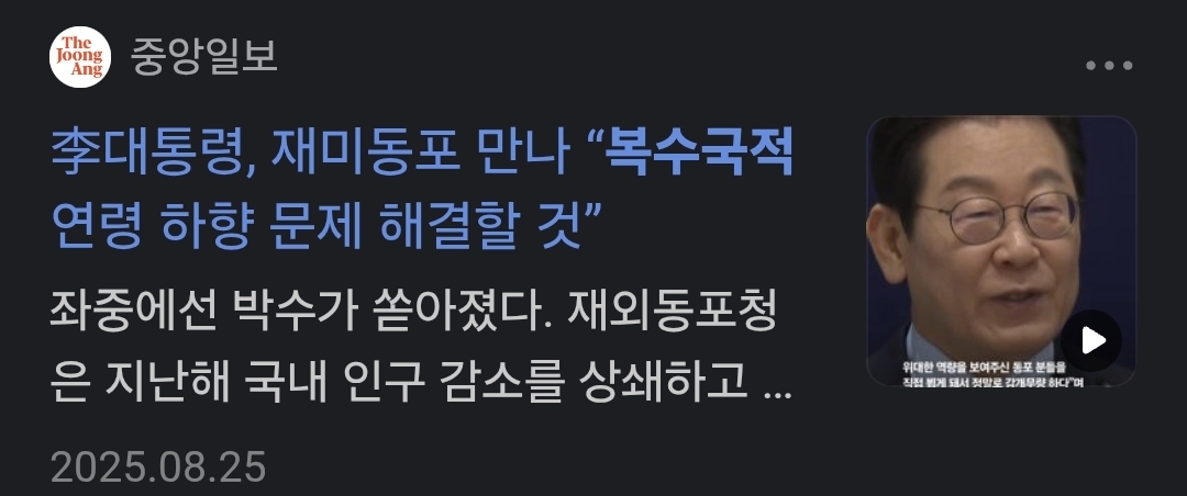 이재명 대통령은 “재미동포 여러분들의 오랜 과제인 복수 국적 연령 하향 문제를 해결하는 데 힘을 쏟겠다”라고 말했다.